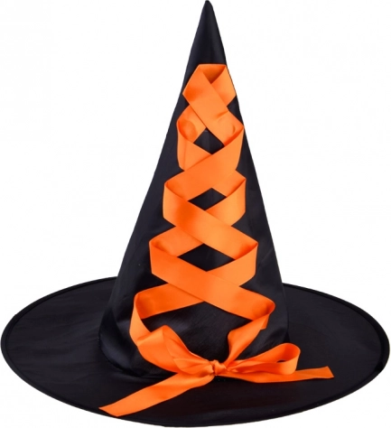 - Špičasti črni klobuk z oranžnim satenastim trakom.