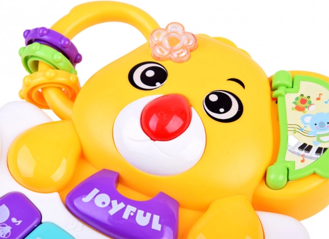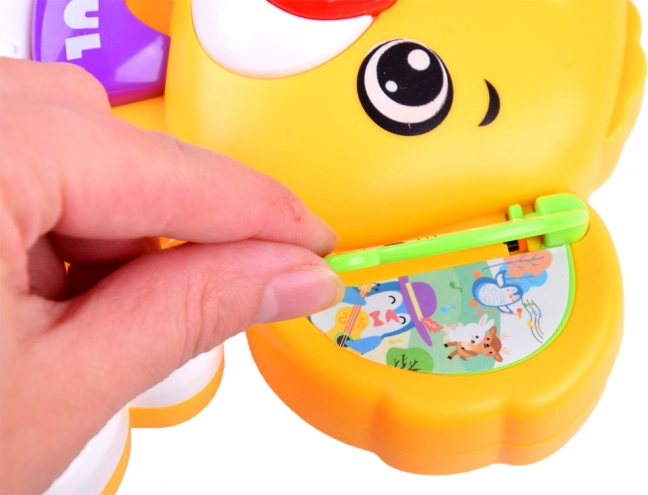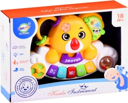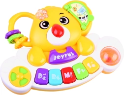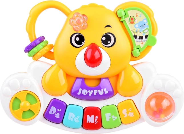 Ta barvit interaktivni klavirček združuje učenje in zabavo. Otroci spoznajo osnovno lestvico Do–So, poslušajo vesele melodije in pristne živalske zvoke (pes, petelin, konj, mačka, slon). Vsak pritisk na tipke spremlja utripajoča lučka, ki menja barve in krepi vidno zaznavanje.