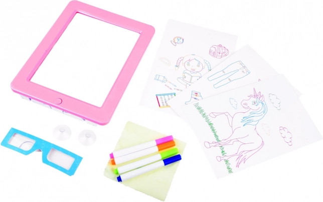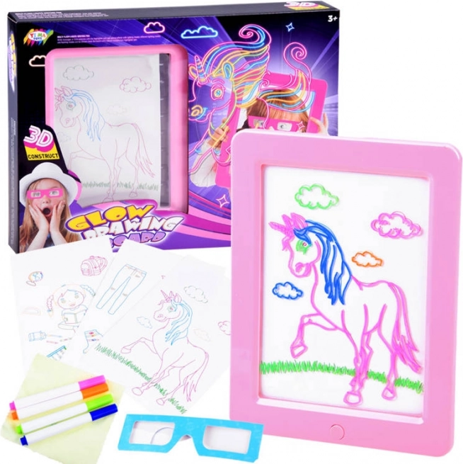 Osvetljena risalna tabla s 3D očali in neonskimi flomastri. LED svetloba, šablone in ponovno brisanje za neskončno kreativno zabavo otrok.