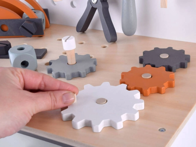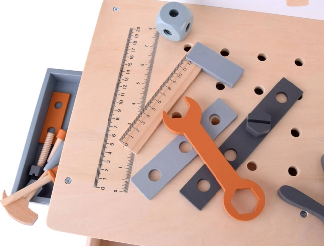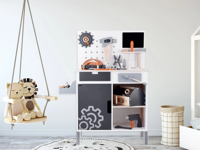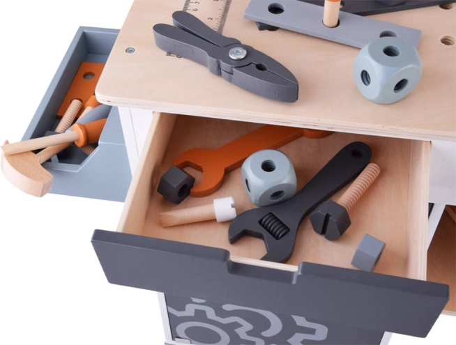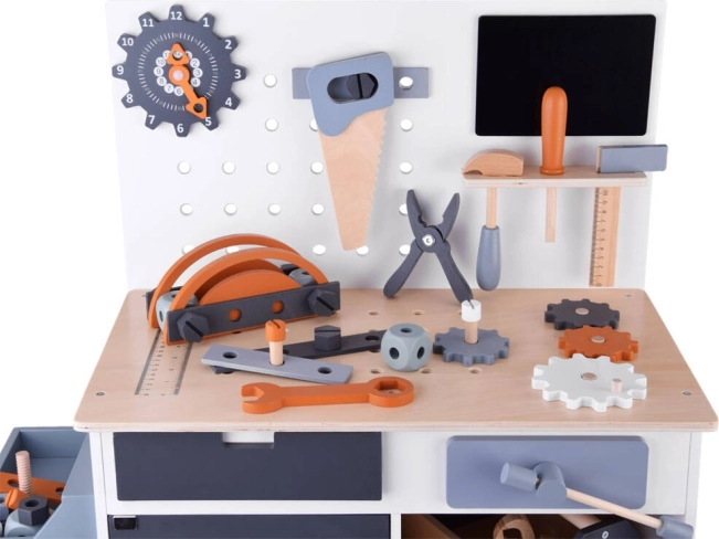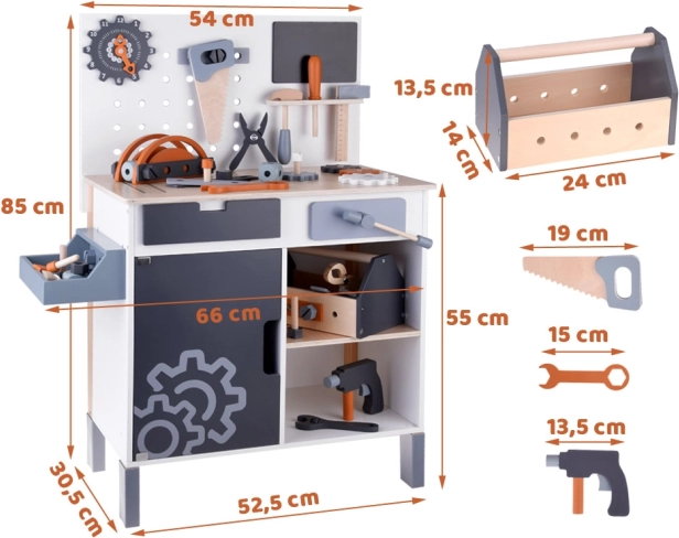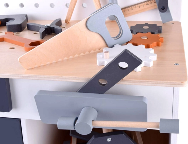 Lesena delovna miza za otroke predstavlja idealno igračo za razvoj kreativnosti in finih motoričnih spretnosti. S širokim izborom orodij, kot so žaga, kladivo, izvijač in še več, se lahko otroci potopijo v svet delovnih iger in simulacije pravega delovnega okolja.