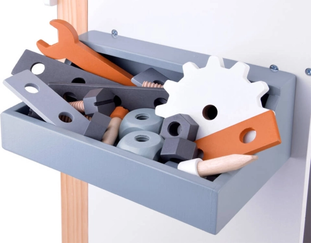 Miza je opremljena s skladiščnimi prostori in pegboardom, ki otroke uči, kako učinkovito organizirati svoja orodja in dodatke.