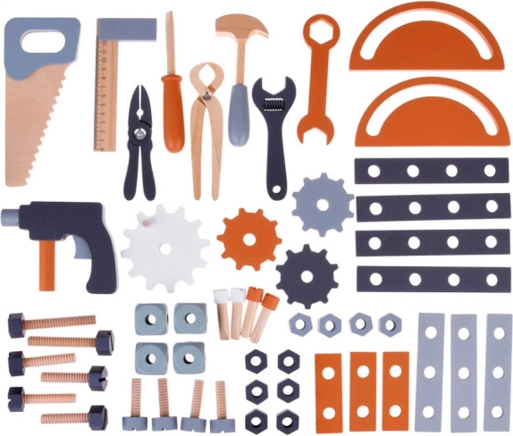 Komplet vsebuje širok izbor orodij, kot so žaga, vrtalnik, kladivo, ključi, izvijači in drugo - idealen za razvoj praktičnih spretnosti.