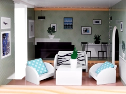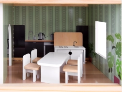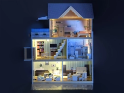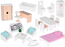 Elegantno leseno pohištvo v naravnih in belih barvah se odlično ujema z nežno izbranimi pastelnimi barvami hišice. Vsako nadstropje in vsak prostor ponujata grafiko na stenah, ki daje notranjosti pridih domačnosti in pomaga pri postavljanju pohištva.