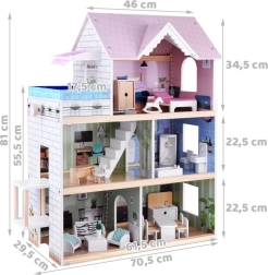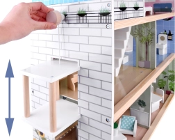 Ta čudovita hišica za punčke vam prinaša realistično in stilno zasnovo, ki bo očarala vsakega otroka. Hišica ima tri nadstropja, napolnjena z natančno opremljenimi prostori: spalnico, dnevno sobo, kopalnico, kuhinjo in dnevno sobo. Premičljivo dvigalo in stilni bazen na terasi dodajata na atraktivnosti in zagotavljata prostor za kreativno igro.