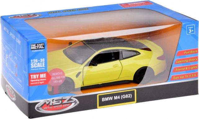 Zbirateljski kovinski model BMW M4 v merilu 1:32 navduši otroke in odrasle. Ima odpirajoča se vrata, realistične svetlobne učinke (sprednje, zadnje luči in osvetljena armaturna plošča) ter zvok motorja, hupa in alarm. Zahvaljujoč frikcijskemu pogonu je dovolj, da avtomobilček potegnete po gladki površini in zapelje naprej.