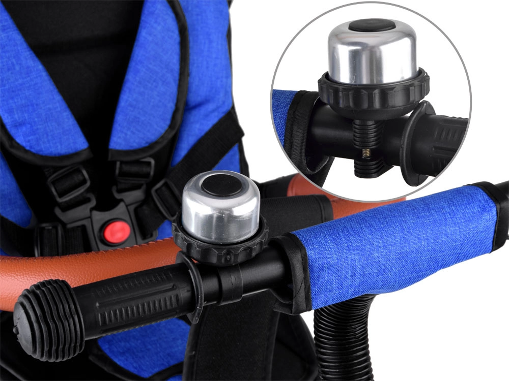 - vrtljiv sedež, 5-točkovni pasovi, varnostna prečka, zložljiva strehica z mrežico, opore za noge, pedala, zvonček, 2 košarici, torba za starše