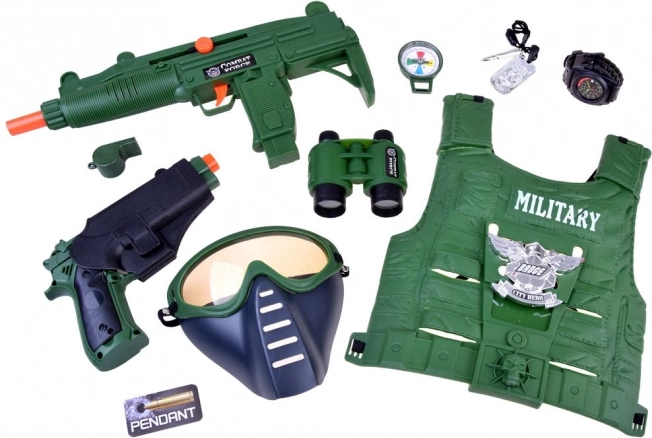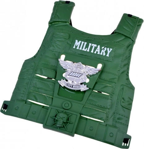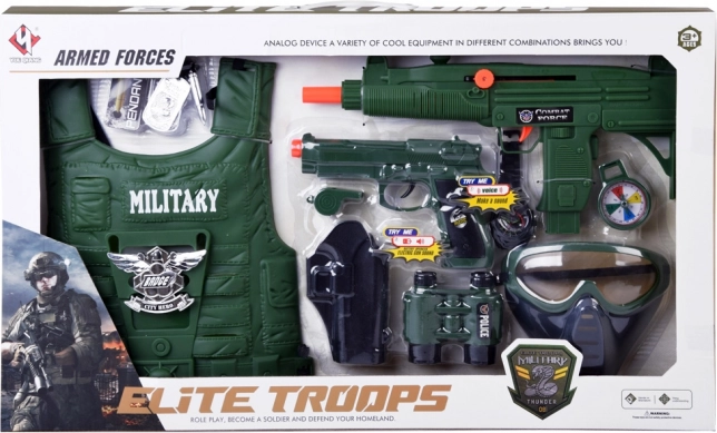 Ta popolna vojaška oprema bo navdušila vsakega malega pustolovca. Z lahkim taktičnim telovnikom in široko paleto dodatkov se otroci zlahka prelevijo v izvidnike, stražarje in junake. Orožja z zvočnimi efekti in snemljiva maska dodajo igri avtentičnost, medtem ko kompas in daljnogled spodbujata domišljijo in orientacijo na terenu.
