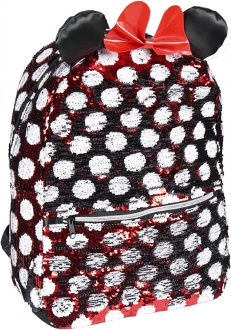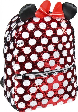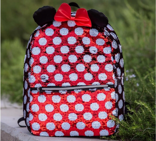 Nahrbtnik s prepoznavnim vzorcem Minnie v rdeče-beli kombinaciji s pikami, okrašen rdečo pentljo in bleščečimi ušesi, je resnično čaroben.