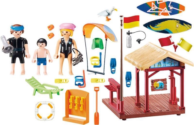 - športna oprema kot kitesurfing, SUP deska, veslo, potapljaška bomba, plavutke, maska s tubo, rešilni obroč, ležalnik, držalo za plavutke, paviljon, opozorilne zastave