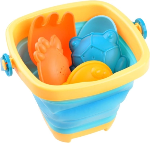Vsebuje vse, kar otroci potrebujejo za ustvarjalno igro v pesku: zložljivo vedro, lopatko, grabljice in tri modelčke.