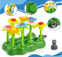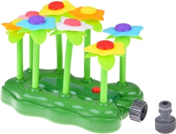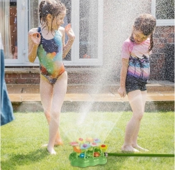Pisani cvetovi se ob vodnem toku zibljejo in pršijo vodo na vse strani – idealno za poletno igranje na travi.