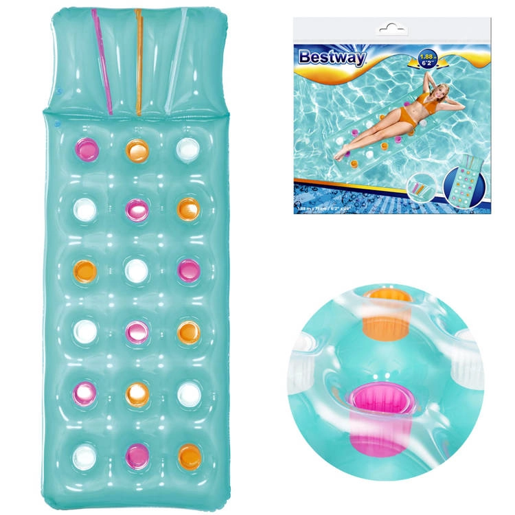 Napihljiva blazina BESTWAY z vzglavnikom 188 × 71 cm. Trpežen PVC, nosilnost 90 kg, lahka in zložljiva. Idealna za bazen in morje. Vključen popravljalni obliž.