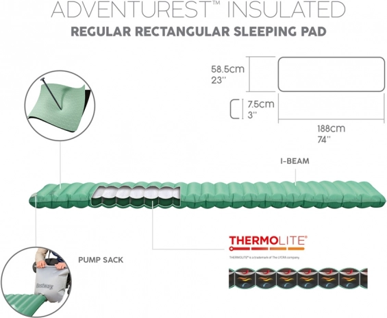 Napihljiva blazina Bestway AdventuRest združuje udobje in funkcionalnost, kar je odlična izbira za prenočitve v naravi. Izdelana je iz odpornega materiala ToughLite z ripstop tkanino, ki ščiti pred predrtji. Del paketa je tudi izolacijski sloj ThermoLite, ki zagotavlja lahkotnost in toplino.
