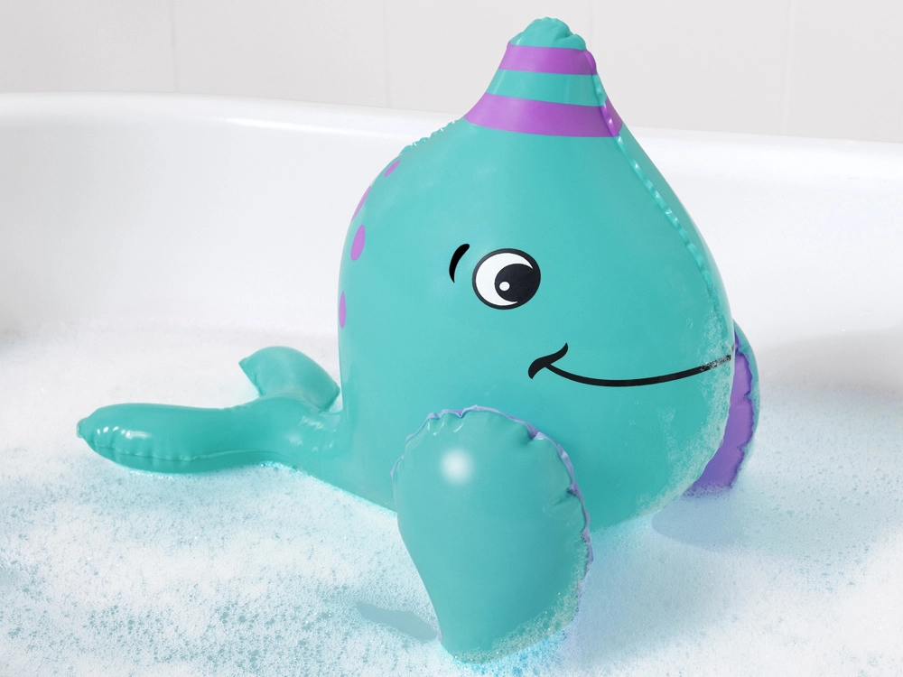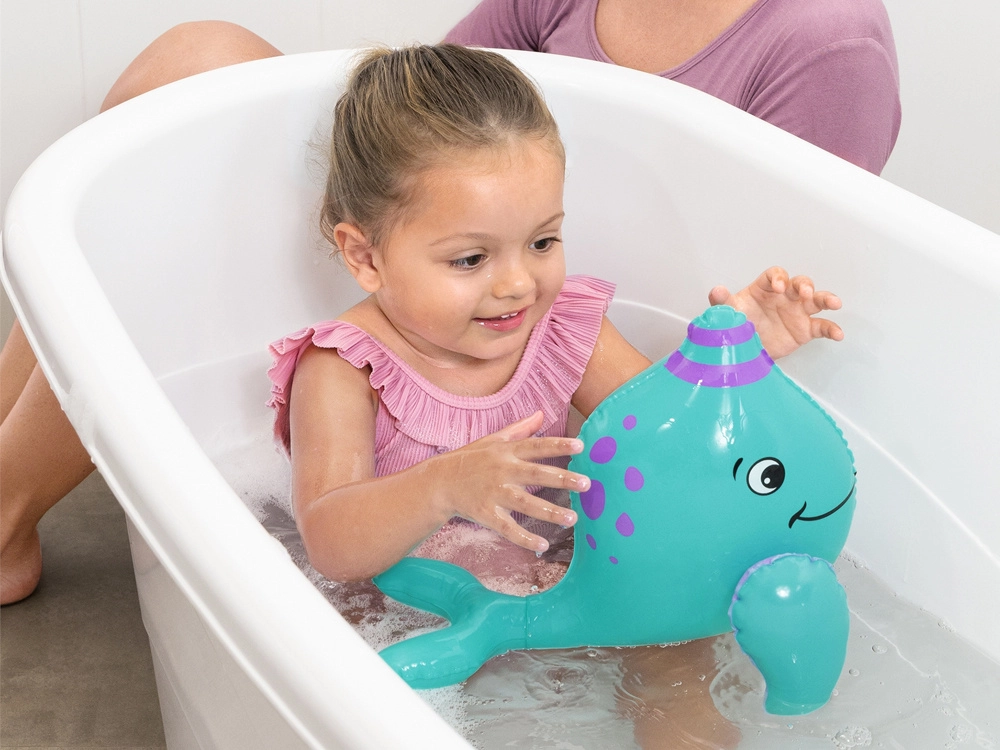 Otroci se potopijo v svet domišljije med igranjem s to napihljivo pošastjo med kopanjem.
