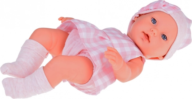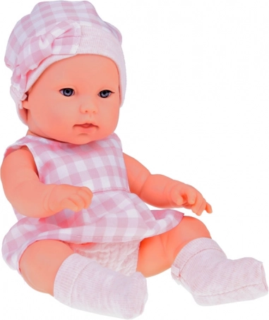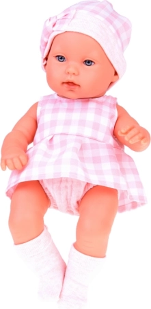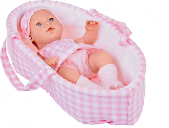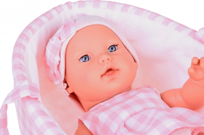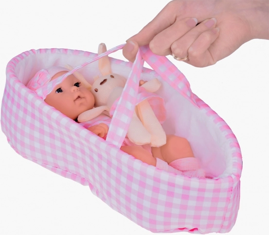Prisrčna novorojenčkova lutka v rožnatem kariranem oblačilu je idealna za ustvarjalno igro in razvoj domišljije. Priložena sta mehak nosilni košarica in plišasti zajček, barvno usklajena z lutkinim stajlingom. Lutka ima realistične poteze, premične okončine in je izdelana iz vzdržljive plastike, ki jo je enostavno ohranjati čisto.