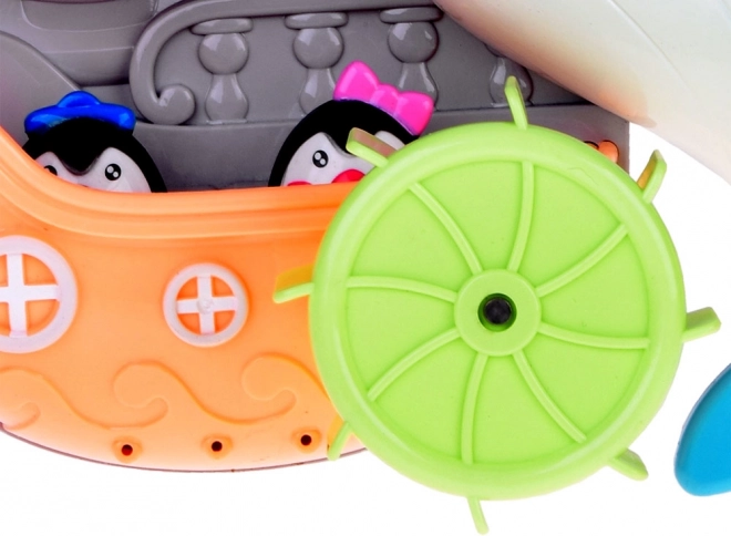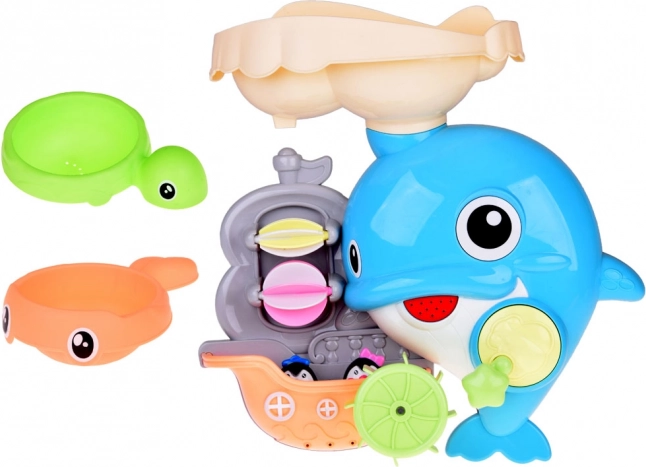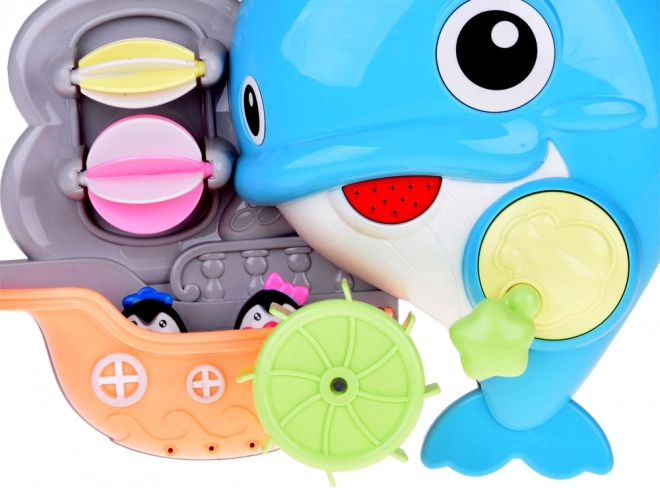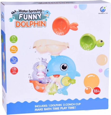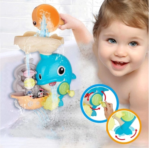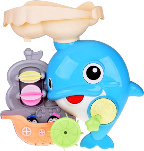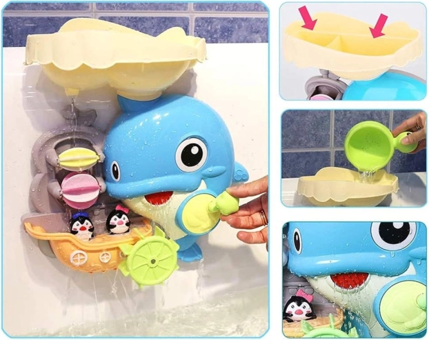 Veseli delfin za v kad je barvita interaktivna igrača, ki otroke vabi k odkrivanju vodnih poskusov. Dovolj je, da v zgornji rezervoar vlijete vodo in opazujete, kako se zavrtijo vodna kolesca, sproži se slap in premakne delfinova plavut. Čolniček z malimi pingvini dopolnjuje zgodbe med kopanjem.
