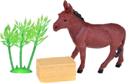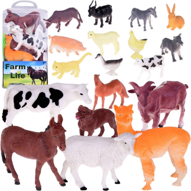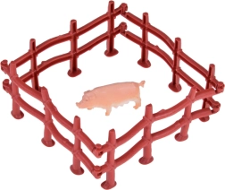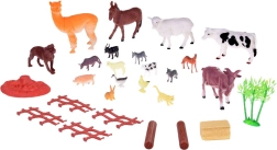 Krava, konj, pes, osel, ovca z jagnjetom, koze, alpaka, prašič, bivol, mačka, zajec, raca in kokoš, dopolnjeni z ograjo, balo sena, debli, grmom in igralno podlago.