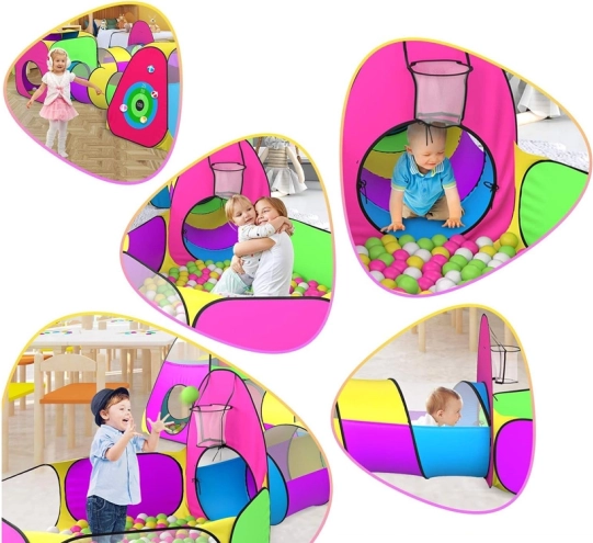 Modularno otroško središče 5v1 prinaša neskončne možnosti. Tri barvne šotore in dva prožna tunela lahko poljubno povezujete in preurejate – od majhnega plezalnega kotička do velikega gigantskega igrišča, dolgega več kot štiri metre. Zahvaljujoč pop-up konstrukciji je sestavljanje vprašanje trenutkov, po igri pa vse preprosto zložite v priloženo torbo.