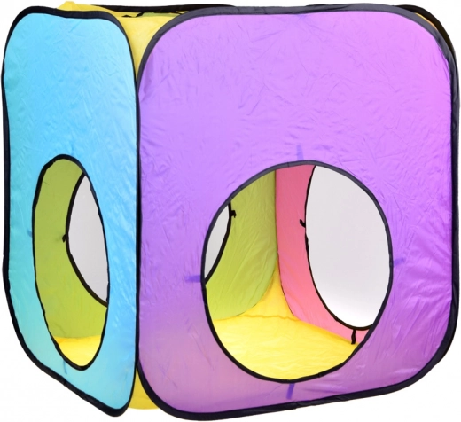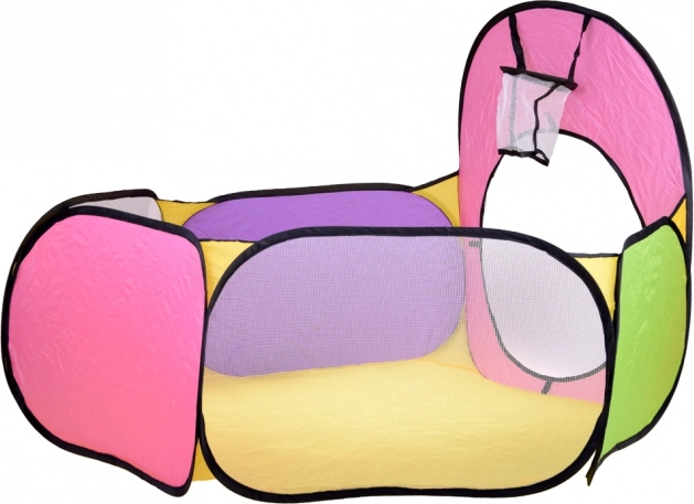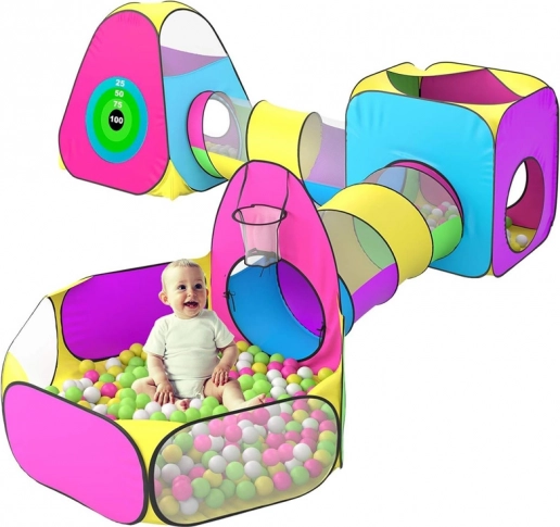 Vsak šotor ponuja druge aktivnosti: trikotni šotor s tarčo in odprtinami za ciljanje žogic s sprijemalnim (ježek) zapiranjem, kvadratni šotor z dvema vhodoma in možnostjo priklopa tunelov ter šotor – bazenček/ograjica, idealen za suhi bazen z žogicami (žogice niso vključene). Barvni paneli in mrežasti deli spodbujajo vizualno stimulacijo in nadzor odraslih.