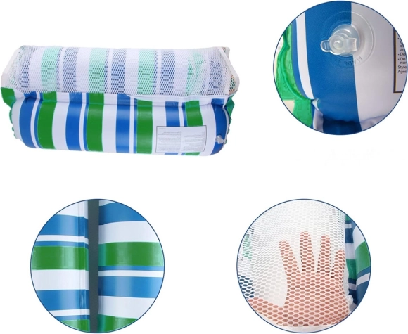 Kombinacija modre, zelene in bele barve je estetsko privlačna in funkcionalna. Posebna najlonska mrežica omogoča pretok vode, s čimer povečuje udobje med uporabo.