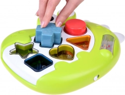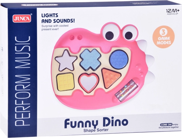 Ta nasmejan Dinozaver ima različne oblike odprtin: trikotnik, kvadrat, krog, srce, zvezda in križec, ki jih otrok mora pravilno postaviti. Vsak kos ima drugačno barvo in teksturo, kar igro naredi senzorično zanimivo. Nekateri deli vsebujejo kroglice, ki ob tresenju ustvarjajo zvok.