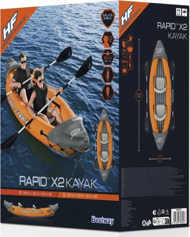 Hydro-Force Lite-Rapid X2 je konstrukcijsko trden kajak, ki zaradi svojih dimenzij 321 x 88 cm zlahka sprejme dve osebi. Kajak je opremljen z napihljivimi sedeži z naslonjali in I-beam konstrukcijo za večjo stabilnost in udobje. Bostonski ventili omogočajo hitro napihovanje in praznjenje. Kajak je prav tako opremljen z odstranljivo plavutjo, ki izboljšuje smerno stabilnost in manevriranje. Izdelan iz trpežnega PVC materiala, kajak enostavno prenese stranske vetrove in zagotavlja prijetno izkušnjo veslanja.