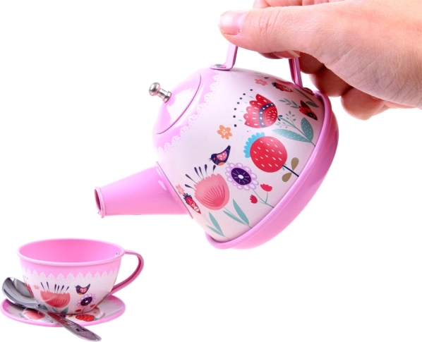 Komplet je kot ustvarjen za male gostitelje, ki želijo servirati čaj punčkam in pliškotom. Pastelne barve in prikupni cvetlični motivi delujejo čarobno, medtem ko kovinska zasnova zagotavlja dolgo življenjsko dobo tudi pri vsakodnevni igri.