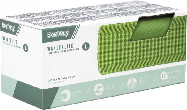 Napihljiva blazina BESTWAY WanderLite Large je zanesljiv spremljevalec za kampiranje, pohodništvo in festivale. Zahvaljujoč velikodušnim meram 198 × 71 × 6,5 cm se odlično poda tudi k večji spalni vreči ter nudi udobno izolacijo in oporo na neenakomerni podlagi. Kombinacija materiala ToughLite in ripstop najlona 70D prinaša visoko odpornost proti drgnjenju in trganju ob nizki teži.
