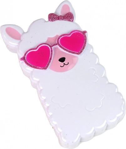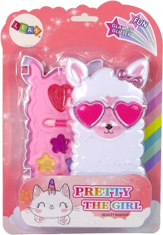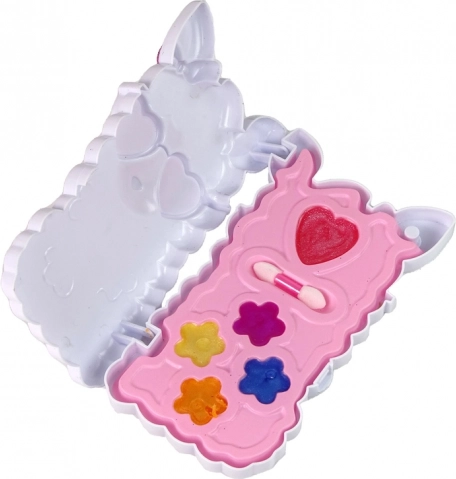 Prisrčna kozmetična paletka v obliki rožnate lame bo razveselila vsako malo navdušenko nad ličili. Vsebuje 4 odtenke bleščil za ustnice, 4 senčila za oči, rdečilo in čopič. Izdelki so brez parabenov, zlahka se odstranijo s toplo vodo in milom ter so idealni za prve poskuse z ličenjem. Kompaktne mere poskrbijo, da se paletka prilega v majhno torbico ali nahrbtnik.