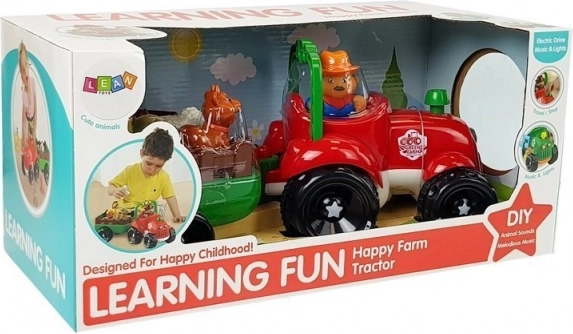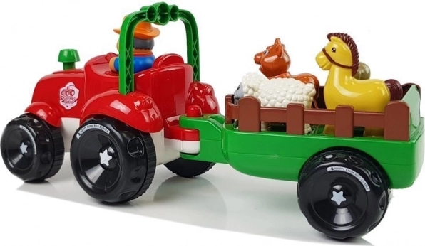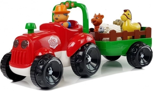 Ta barvit traktor z odklopljivo prikolico otrokom prinaša veselje ob odkrivanju življenja na kmetiji. Svetloba v žarometih ter realistični zvoki vožnje in troblje igri dodajo pristnost. Z enostavnim pritiskom na dimnik se traktor zapelje naprej, medtem ko prikolica prevaža živali na njihov cilj.