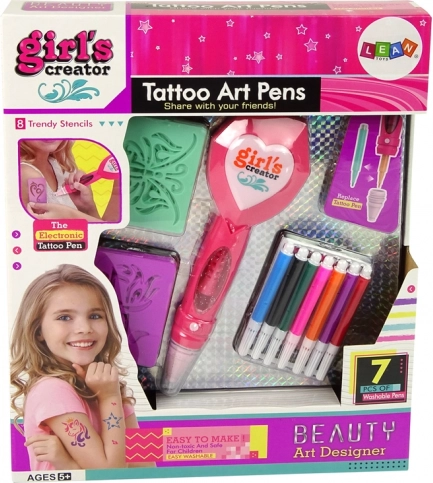 Ustvarjalni komplet za otroke, ki omogoča izdelavo barvitih, zlahka odstranjivih začasnih tetovaž. Vsebuje elektronsko pero, 6 varnih markerjev in 8 šablon za hitro in zabavno okraševanje kože. Odlična izbira za zabave ter za razvoj ustvarjalnosti, natančnosti in potrpežljivosti.