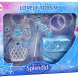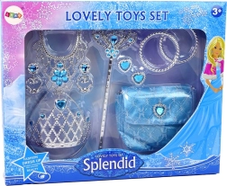 Vključuje elegantno torbico z odpiranjem, čudovito elastično krono in paličico, ki princesi podarijo izjemen videz. Poleg tega komplet vsebuje modne dodatke, kot so ogrlica, zapestnice, prstani in uhani – vse, kar je potrebno za kraljevski videz.