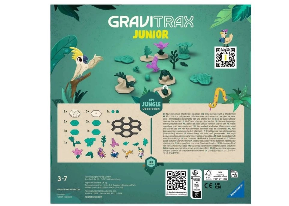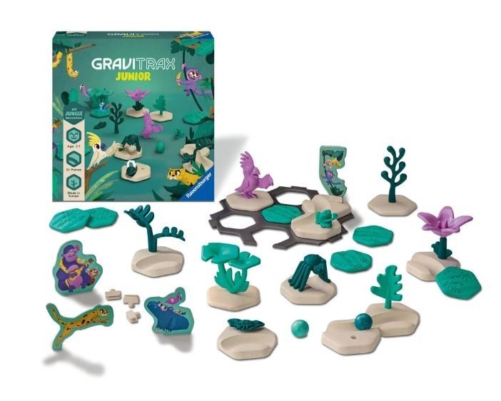 GraviTrax Junior je interaktivni sistem krogličnih stez za otroke od 3 let. Najmlajši si gradijo svoje lastne svetove krogličnih stez, ki jih lahko po želji okrasijo in tako ustvarijo posamezne tematske svetove. Otroci bodo pri ustvarjalnem sestavljanju uživali obilo zabave. Razširitev Džungla vsebuje različne dekorativne elemente ter figurice živali in rastlin iz džungle. Otroci lahko tako znotraj proge GraviTrax raziskujejo to okolje in začnejo pustolovščino v džungli. Vsi gradbeni in dekorativni deli so izdelani iz lesenega bioplastike. Razširitev vsebuje 33 gradbenih in dekorativnih elementov.