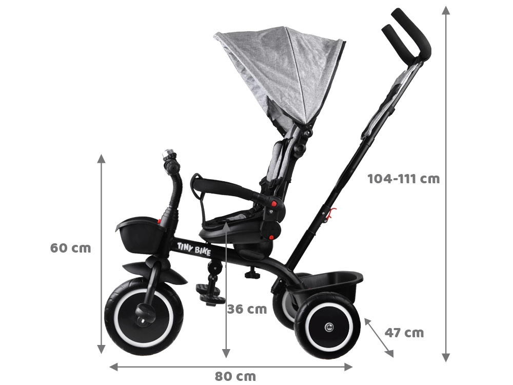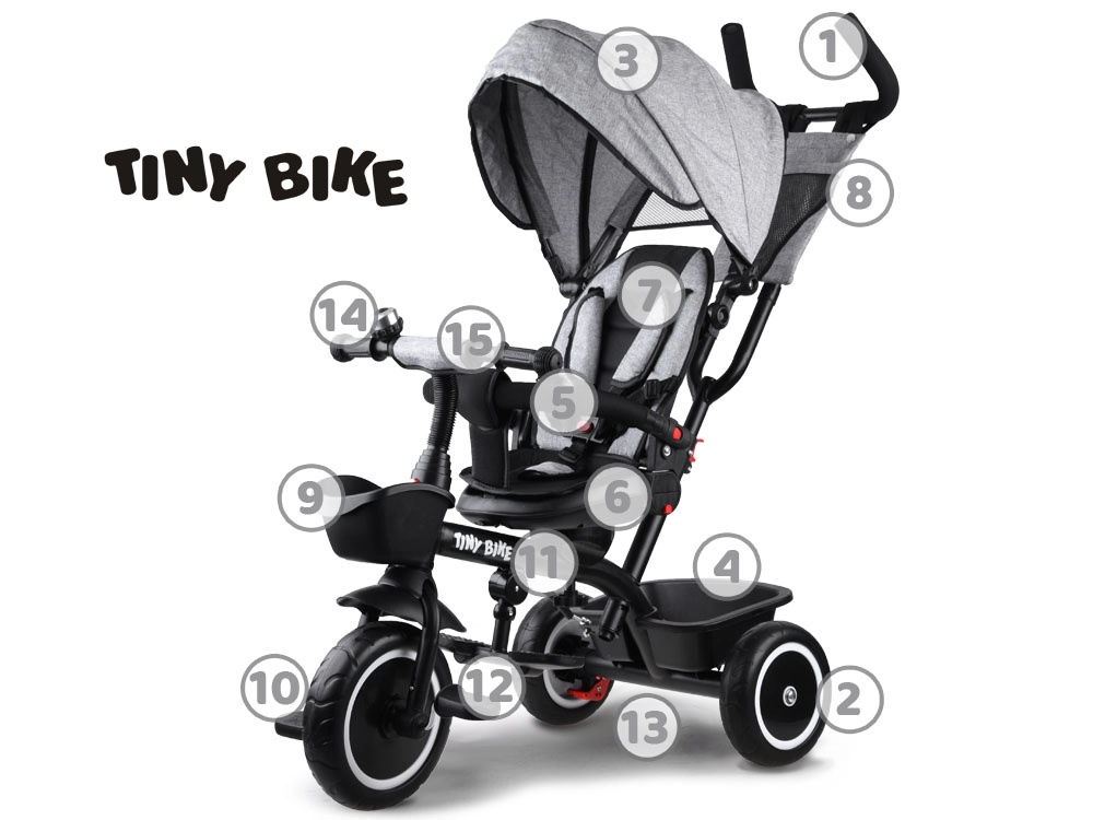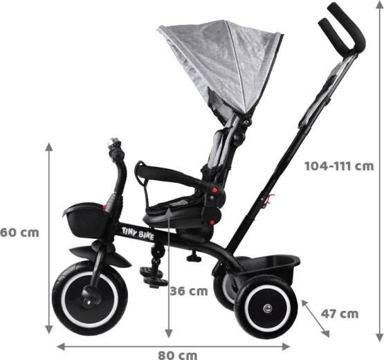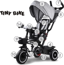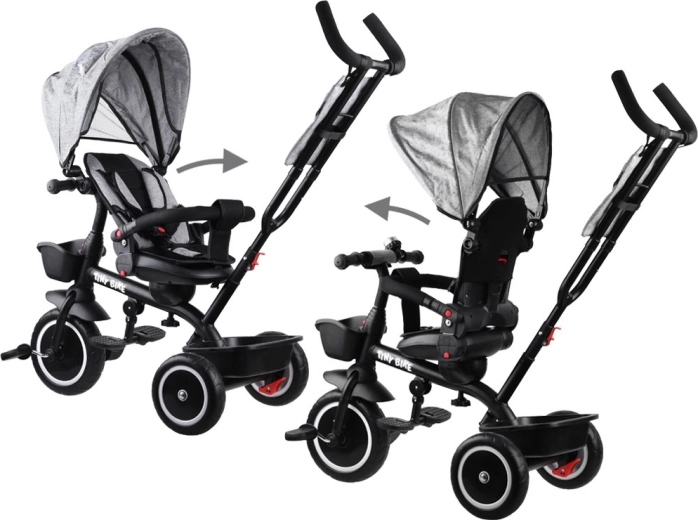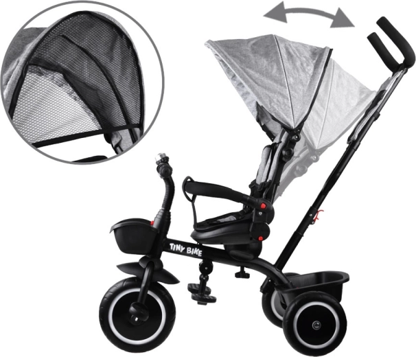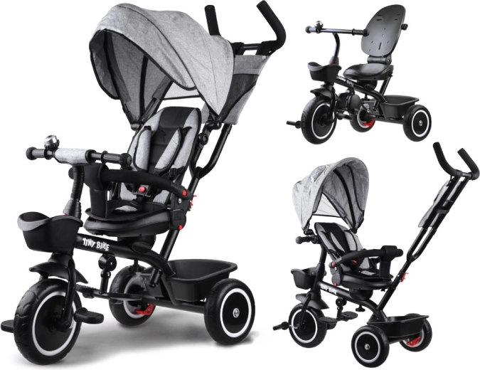 Multifunkcijski otroški tricikel 3v1 TINY BIKE z vrtljivim sedežem združuje funkcijo potisnega tricikla, vozička in samostojnega kolesa s pedali. Ponuja 5-točkovni varnostni pas, zložljivo sončno strešico z mrežico, brezvzdrževalna EVA kolesa, zadnje zavore ter bogat nabor dodatkov za udobne in varne vožnje od 6 mesecev do približno 5 let.