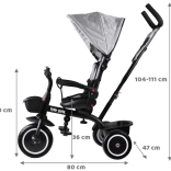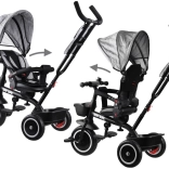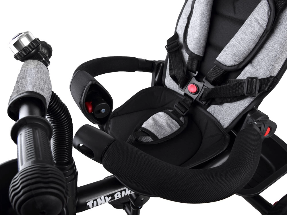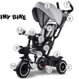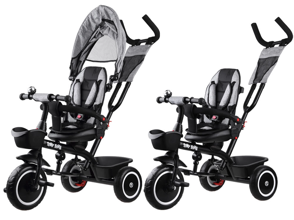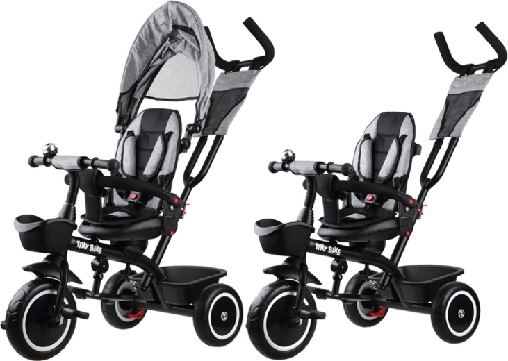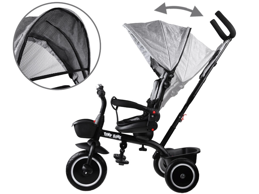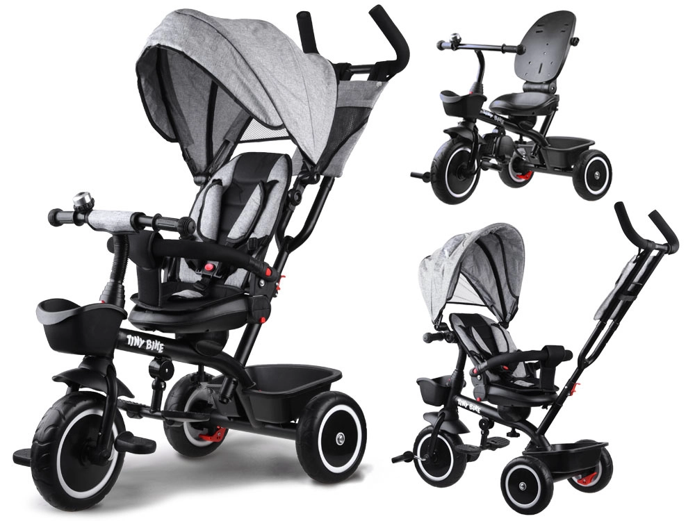 Multifunkcijski otroški tricikel 3v1 TINY BIKE z vrtljivim sedežem združuje funkcijo potisnega tricikla, vozička in samostojnega kolesa s pedali. Ponuja 5-točkovni varnostni pas, zložljivo sončno strešico z mrežico, brezvzdrževalna EVA kolesa, zadnje zavore ter bogat nabor dodatkov za udobne in varne vožnje od 6 mesecev do približno 5 let.
