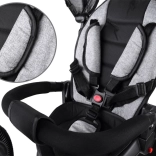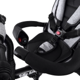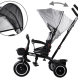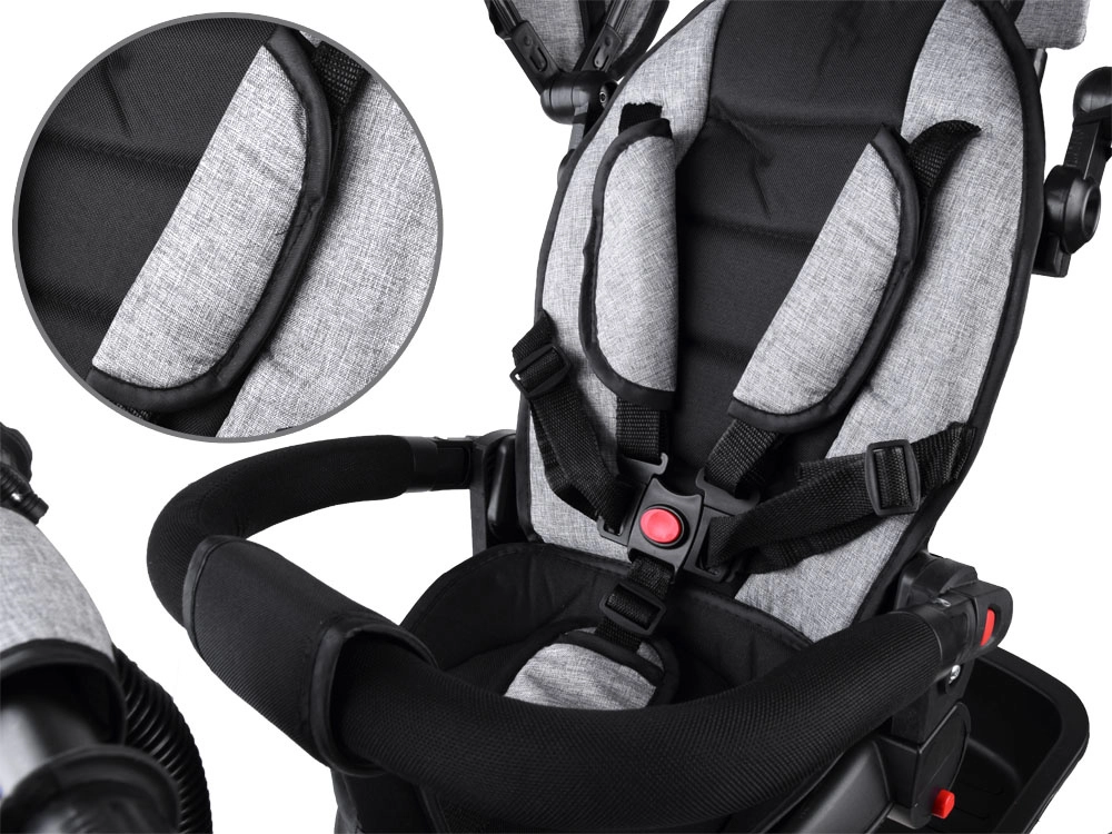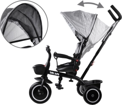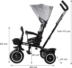 Tricikel 3v1 raste skupaj z otrokom: od načina z vodenjem starša preko prvih poganjanj do samostojne vožnje. Vrtljiv in nastavljiv sedež z mehko prevleko, 5-točkovni varnostni pasovi in oblazinjen varnostni lok zagotavljajo največjo varnost in udobje. Zložljiva strešica z zadnjo mrežico prezračuje in ščiti pred soncem, vetrom ter rahlim dežjem.