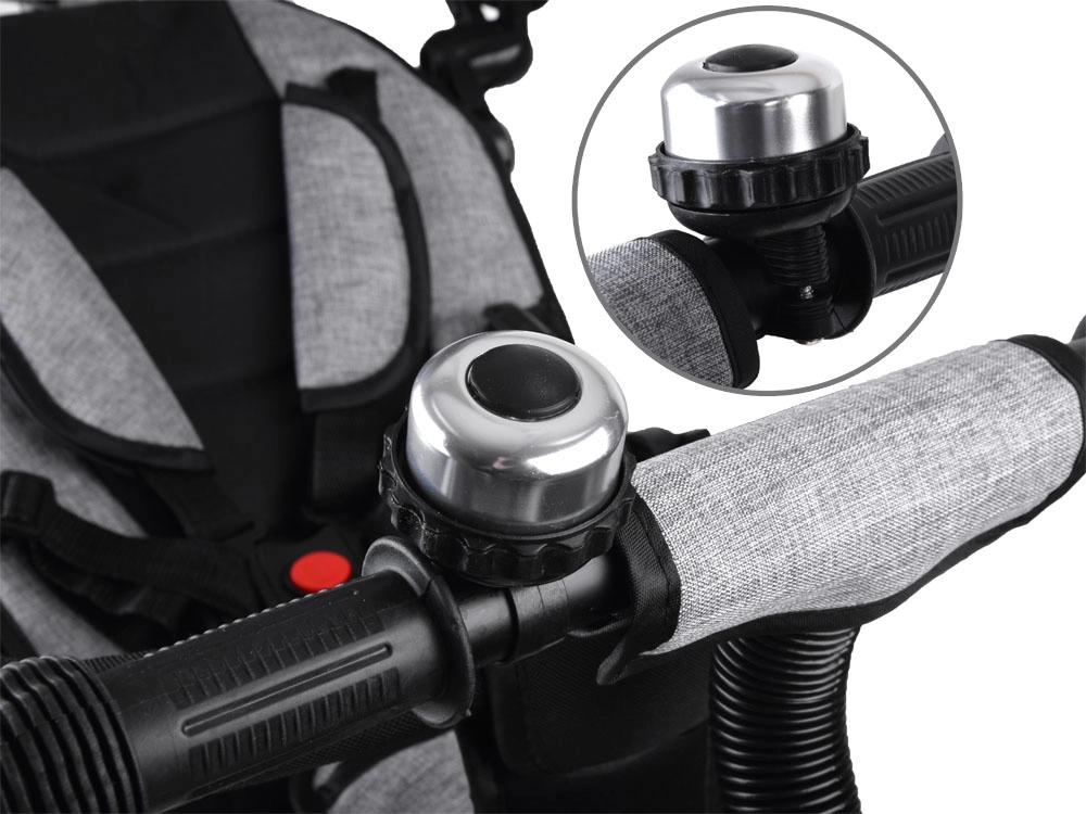 Kovinski zvonček za varno opozarjanje okolice in udobni penasti ročaji na vodilni palici olajšajo staršem vodenje tricikla v prometnem okolju.