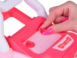 Kosilnica je izdelana iz trpežne plastike in je na voljo v barvah, ki so všeč otrokom, zato je privlačna in varna. Njena široka osnova zagotavlja stabilnost med igro, ergonomska zasnova pa olajša upravljanje najmlajšim.