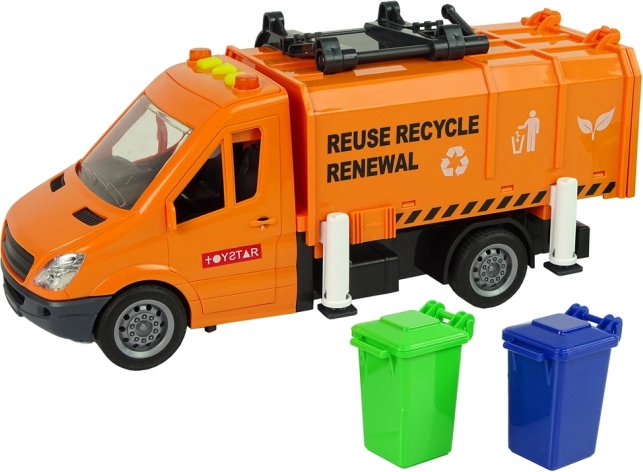 Oranžno smetarsko vozilo zvesto posnema pravi tovornjak za odvoz odpadkov in otroško sobo spremeni v majhen reciklažni center. Zahvaljujoč frikcijskemu pogonu je dovolj, da vozilo potisnete, in zapelje samo. Odpirajoči se zabojnik omogoča enostavno izpraznitev “odpadkov”, medtem ko stranski dvig omogoča, da se vsebina košev nasuje neposredno v nadgradnjo.