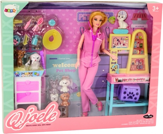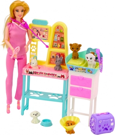 .Veterinarski set punčk je celovita igrača, ki otroke popelje v fascinanten svet skrbi za živali. Osrednja figura seta je punčka zdravnica, oblečena v zdravniško uniformo, ki ji daje avtentičen videz veterinarke. Njeni gibljivi udi in zapestja ji omogočajo, da udobno izvaja različne geste, na primer drži žival v naročju ali upravlja z medicinskimi pripomočki.