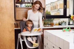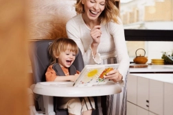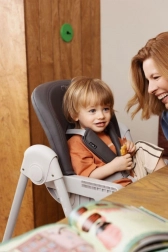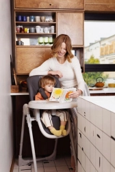 Stolček ima dvostopenjsko nastavitev pladnja, kar je pomembno, zunanji pladenj pa je mogoče pomivati v pomivalnem stroju.