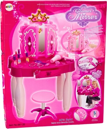 Čarobna otroška toaletna mizica z interaktivnim ogledalom in upravljanjem s paličico spremeni vsakodnevno igro v pravljično dogodivščino. Ponuja svetlobne učinke, melodije, vhod za MP3 in bogato priloženo opremo za male razvajenke. Varno nezlomljivo ogledalo, praktičen predalček za zaklade in modna rožnata barva bodo navdušili vsako malo princeso.