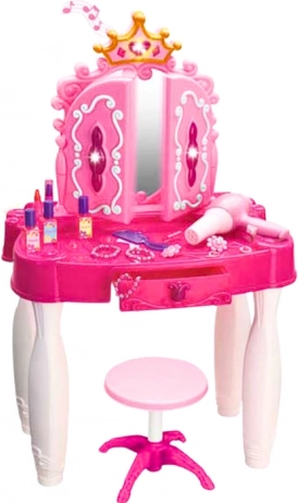 Dovolite otroku vstop v svet domišljije s toaletno mizico, katere ogledalo se ob zamahu s čarobno paličico zasveti in ga spremlja z melodijami ter utripajočimi lučkami. Zahvaljujoč vhodu za MP3 lahko med ličenjem in pričeskami zveni najljubša glasba.