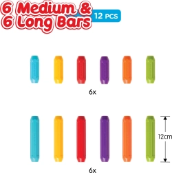 Set vsebuje palice v različnih barvah, ki spodbujajo ustvarjalnost in omogočajo izdelavo privlačnih, barvitih konstrukcij.