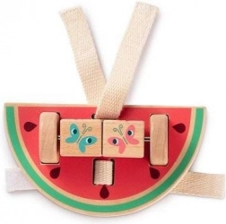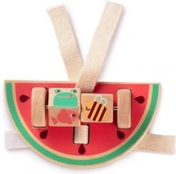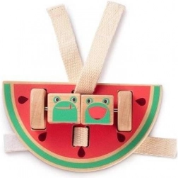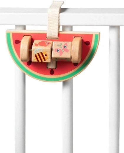 Barvita igrača v obliki lubenice, opremljena z kovinsko palico in vrtečimi kockami, nudi zabavo in podpira razvoj fine motorike otrok.