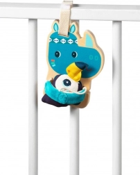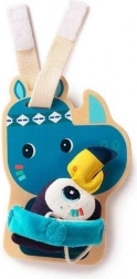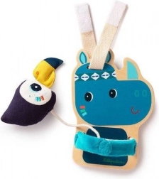 Lesena igrača v obliki nosoroga, ki drži mehkega prijatelja tukana, je zasnovana tako, da stimulira senzorično dojemanje in spodbuja radovednost otrok.