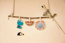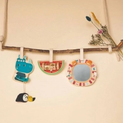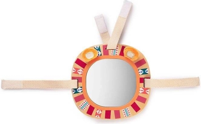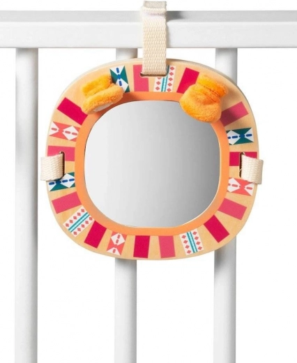 Ogledalo z lesenim okvirjem in motivom leva je idealno za vizualno stimulacijo in podporo raziskovalnim veščinam malih otrok.