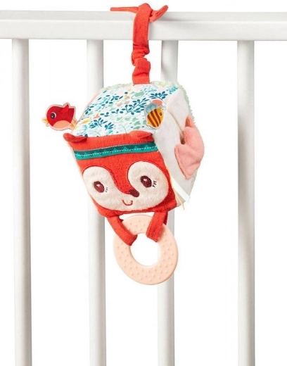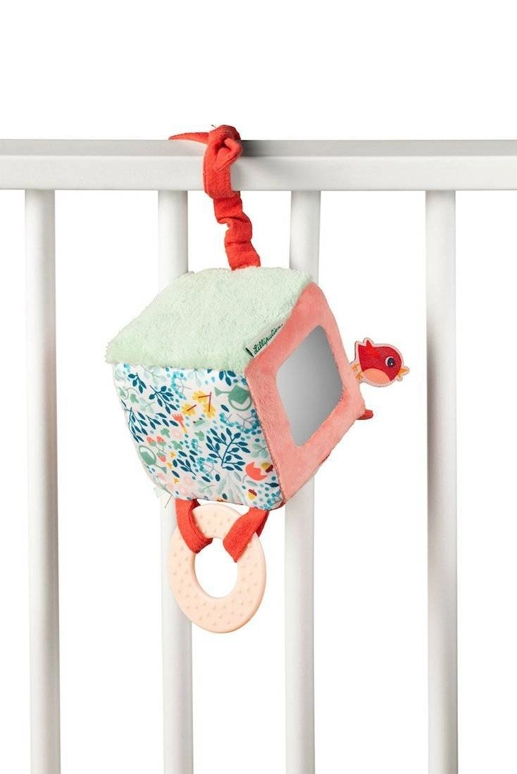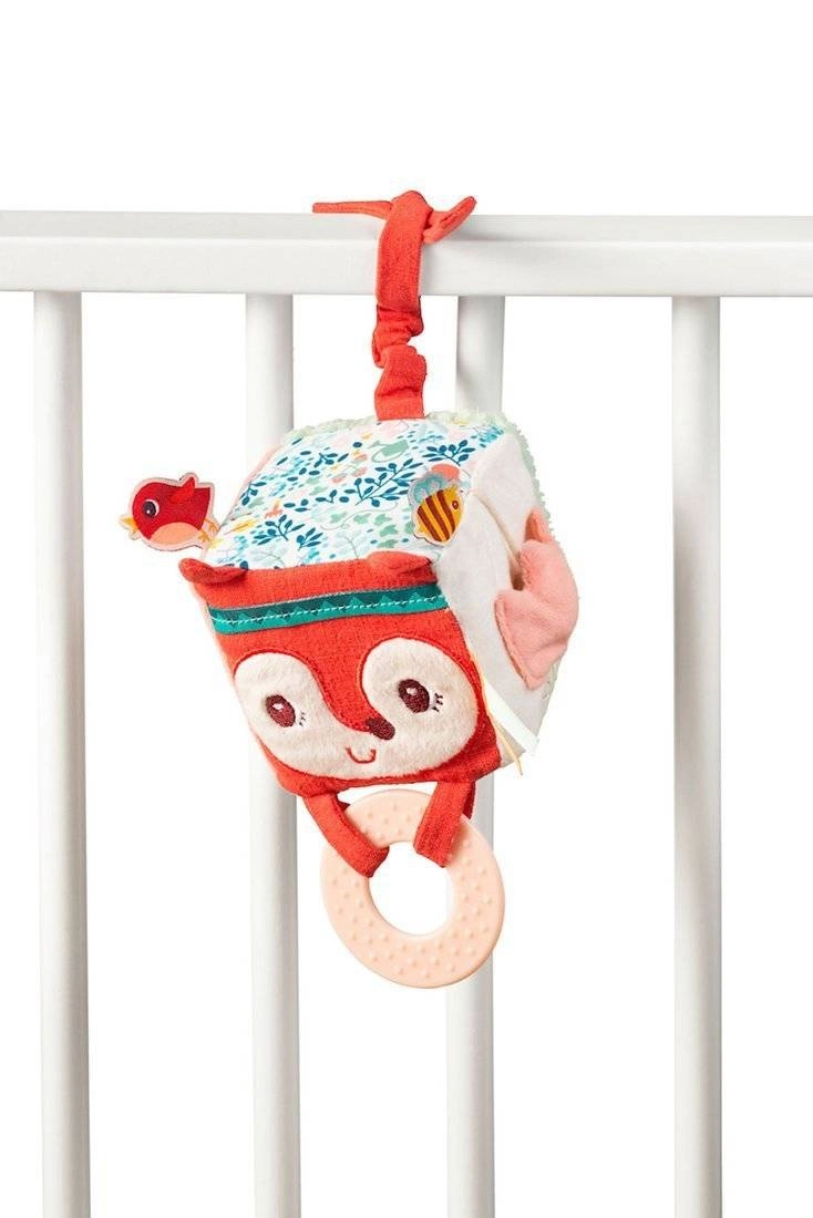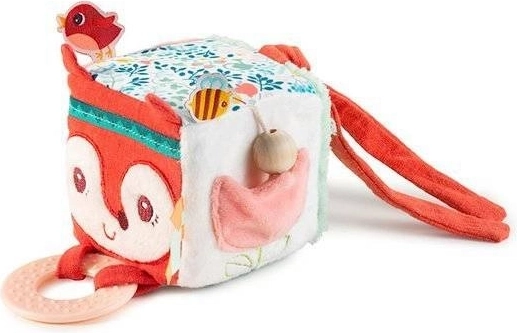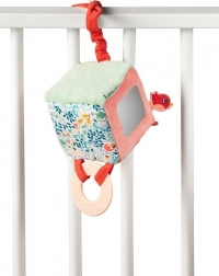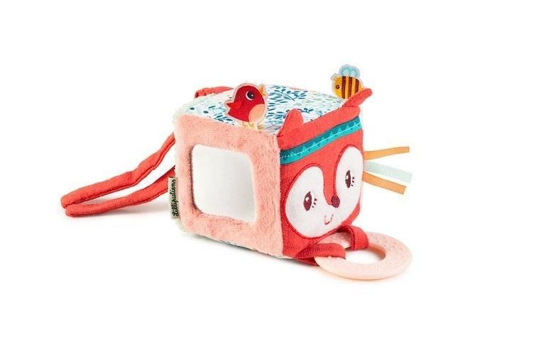 Kocka vsebuje različne spodbudne elemente, vključno z ogledalcem, ropotuljico in šumečimi paneli, ki razvijajo otrokovo zaznavanje čutov.