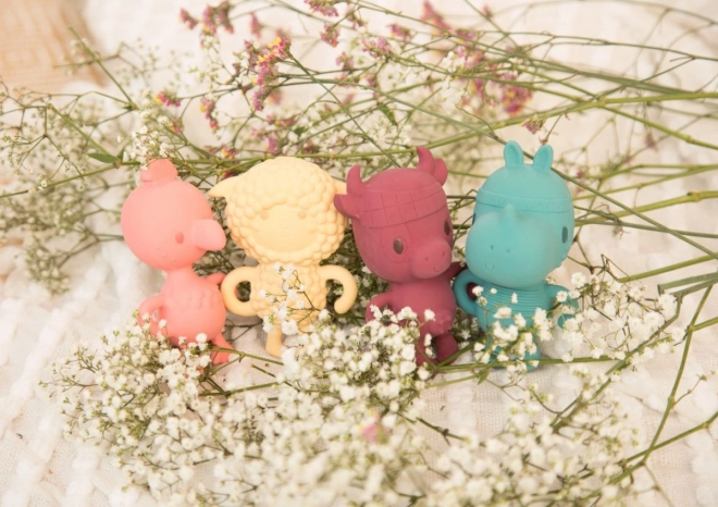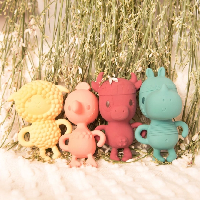 Izdelano iz 100 % naravnega kavčuka, barvanega z rastlinskimi pigmenti. Igrača je pralna, trpežna in primerna za vsakodnevno uporabo.