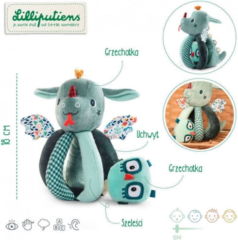Prisrčna ropotuljica in prijemalna igrača v obliki zmajčka Joe znamke Lilliputiens razveseli dojenčke od 6 mesecev naprej. Ponuja različne teksture, šumenje in zvončkljajočo ropotuljico za spodbujanje čutov in razvoj fine motorike. Zaradi mehkih zank se zlahka drži, spodbuja vstavljanje in izvlečenje ter uči razumeti vzrok in posledico. Igrača je mehka, varna in se lahko pere v pralnem stroju.